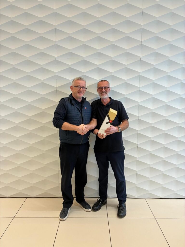 Paul Curtis (left), Head of Aftersales, congratulating Steve Lodge.